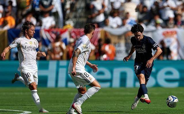 现在巴黎的阵容,简直“恐怖如斯”!前场三叉戟能跑能抢能传,中场维蒂尼亚和若昂-内维斯掌控节奏,法比安前插如刀;两翼的阿什拉夫和努诺-门德斯进攻时比边锋还猛,防守时又能及时回位。这场比赛,皇马中场克罗斯和莫德里奇被挤得连出球空间都没有,后防吕迪格和卡瓦哈尔更是被冲得七零八落。
